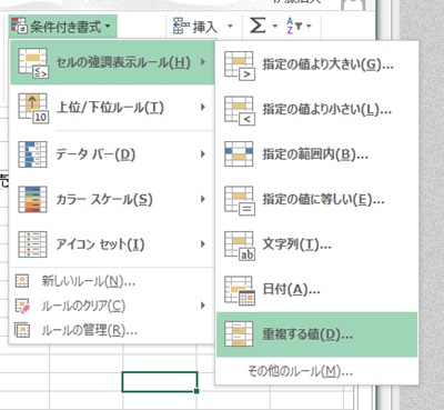 「セルの強調表示ルール」「重複する値」を
